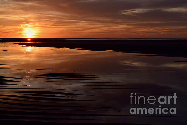 A beautiful sunset on First Encounter Beach,Cape Cod. This beach has a tide that goes out for miles creating tide pools and sand bars on the beach flats. When you get the right weather, the clouds and sun create their magic wondrously reflected on the still water left behind from the slow receding ocean.